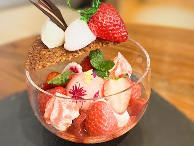 トップにはアーモンドチュイール、苺アイス、スイートチョコレートの飾り、飴細工をあしらい、華やかな仕上がりに。この季節だけの一日限定5食のご提供です。